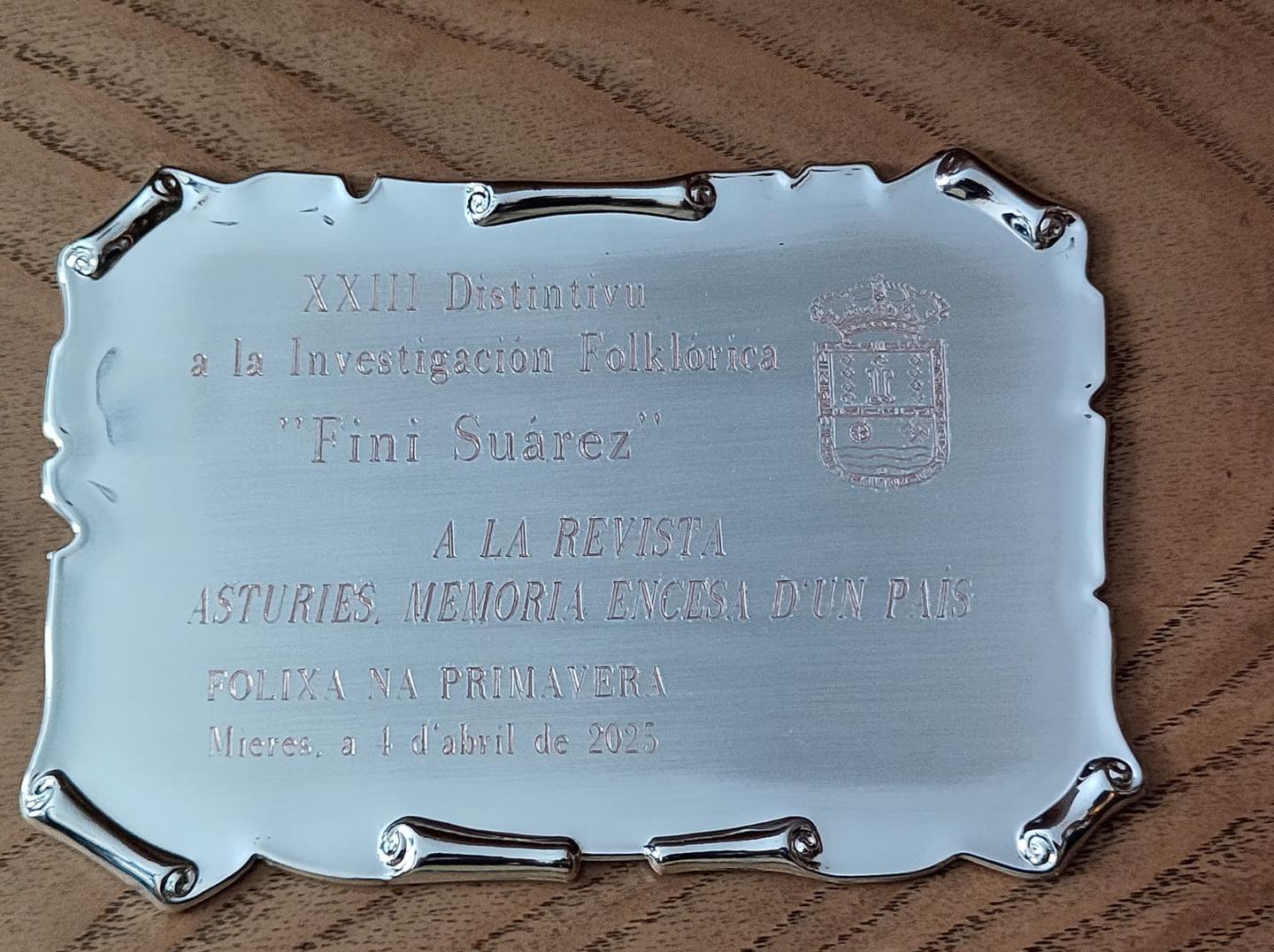 Esti sábadu, en Mieres, nel marcu de la Folixa na Primavera, asistimos a la entrega del Distintivu Fini Suárez a la nuestra revista “Asturies, memoria encesa d’un país”. Recoyéronlu Lisardo Lombardía, Presidente d’Honor, y Xuan Fernández-Piloñeta, Presidente de la Fundación Belenos.